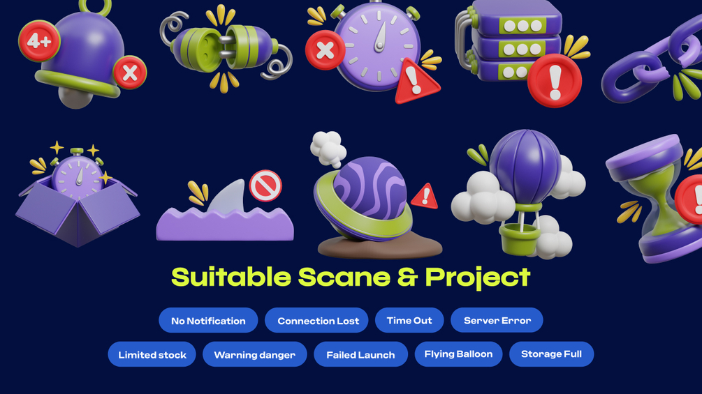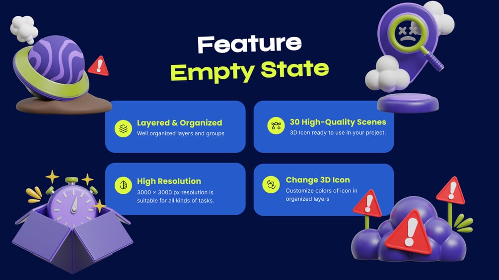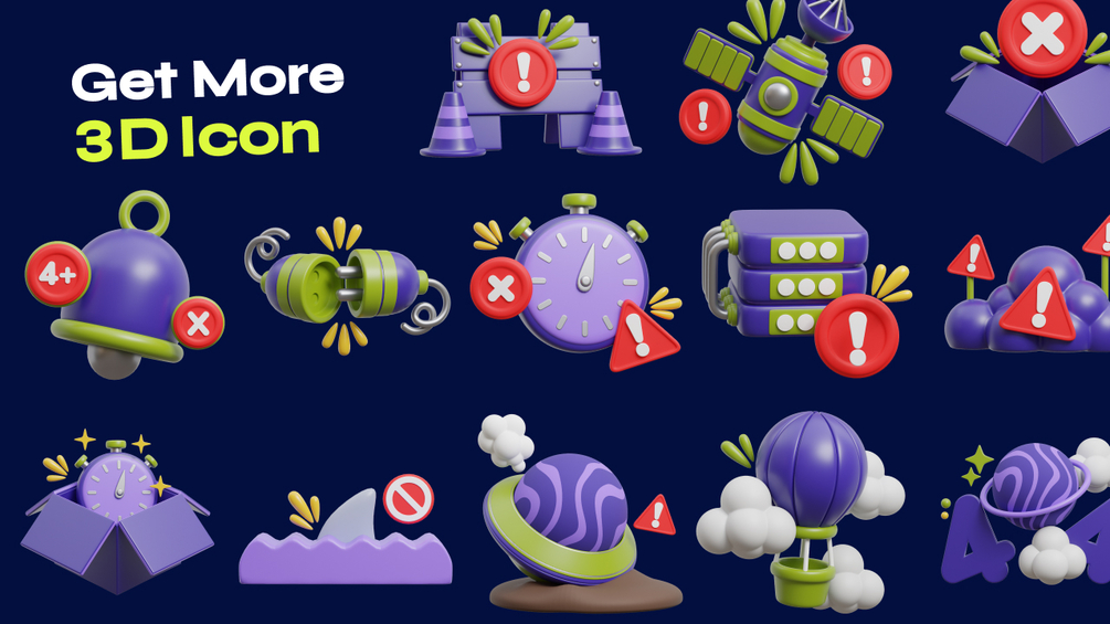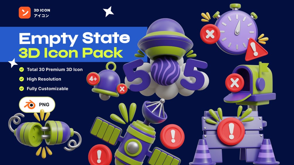 - 30 Premium 3D Icons: Covering scenarios like 404 Errors, No Internet, Server Maintenance, Empty Inbox, Timeouts, and more.