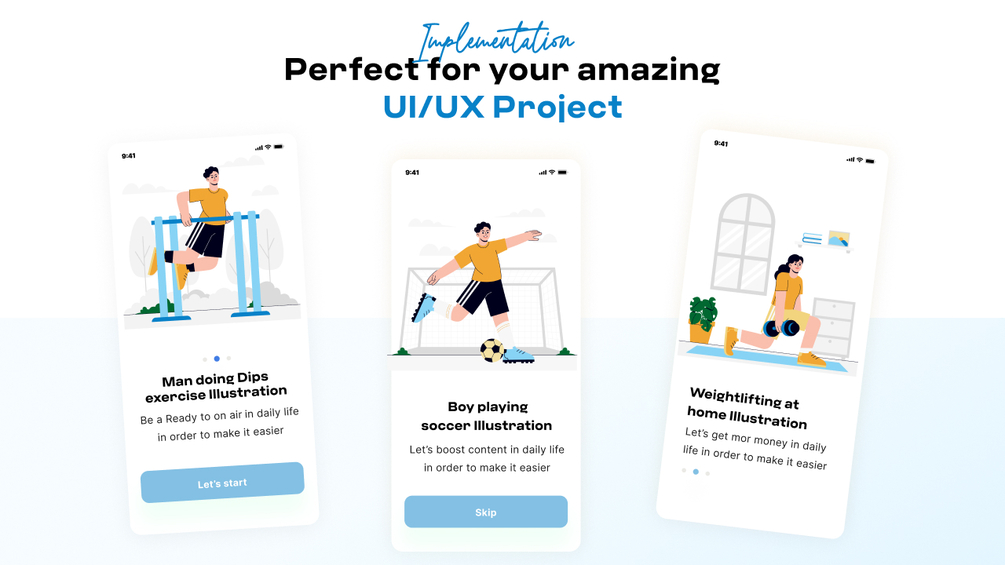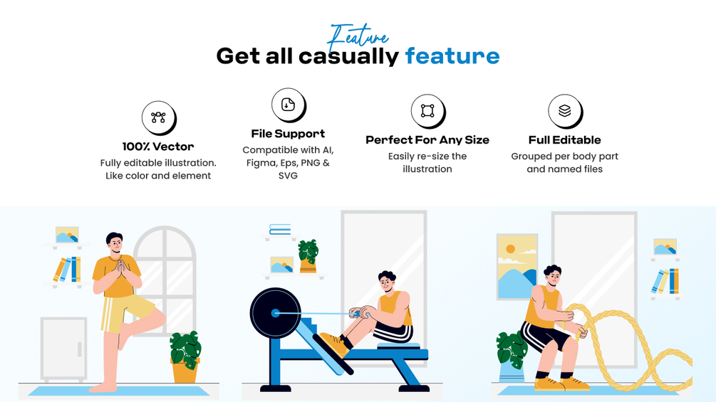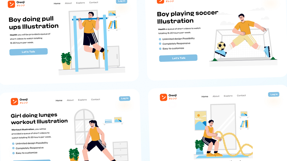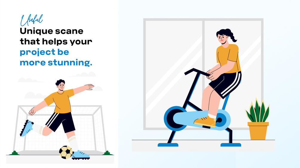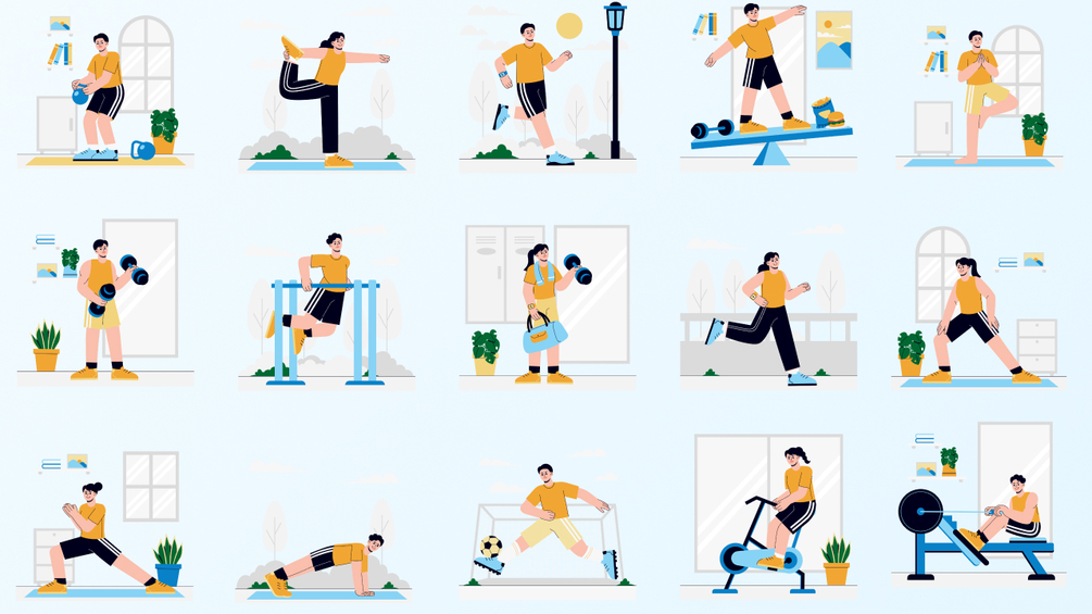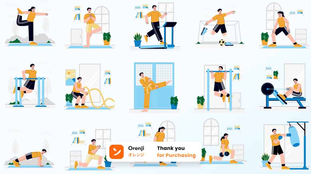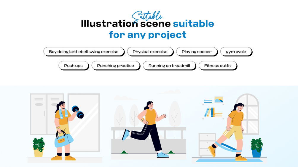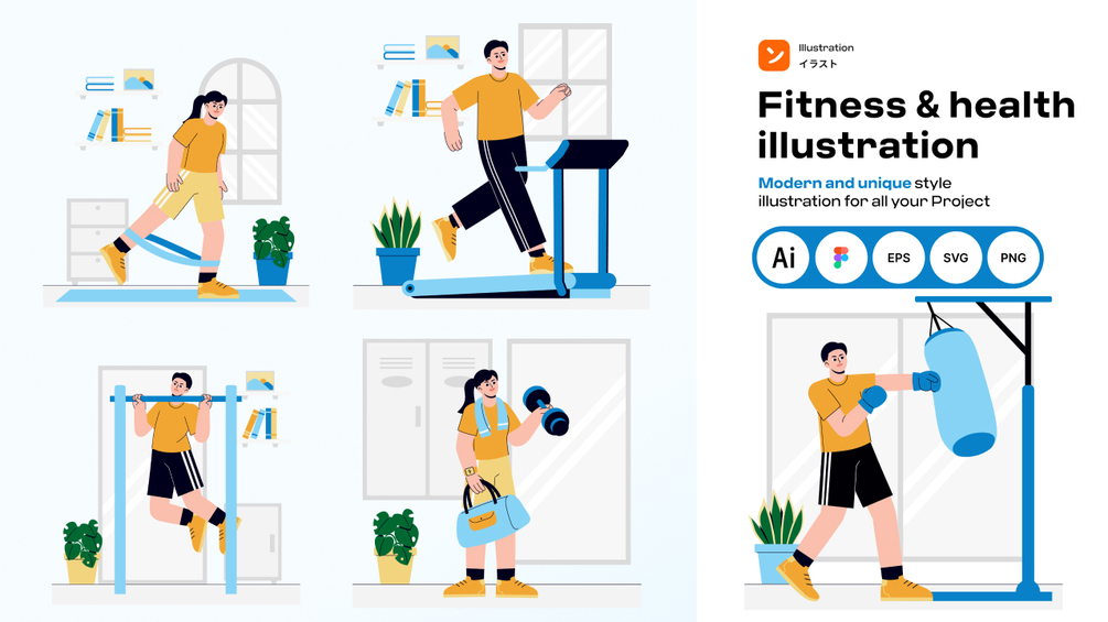 Elevate your health, fitness, or gym-themed project with this modern and unique 2D illustration pack. This set includes 4 high-quality, ready-to-use scenes featuring characters exercising: running on a treadmill, boxing, doing pull-ups, and using resistance bands.