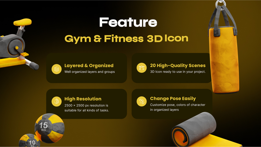 Gym and Fitness 3D Icon pack, Suitable for website, app, presentation and other projects you create. Adaptable with your brand guideline, because you can change the color easily