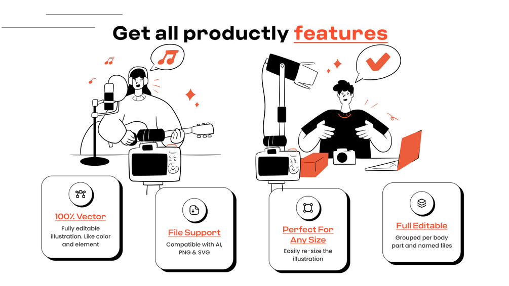 100% vector editable and scalable. The color is easy to change. Each illustration is organized, named & very easy to use.