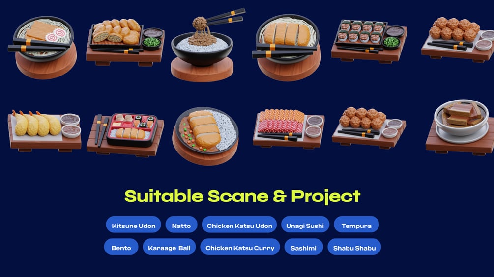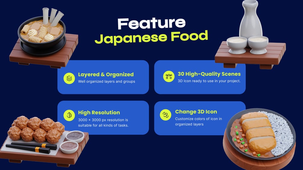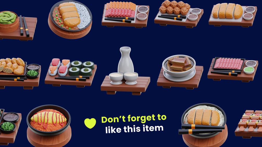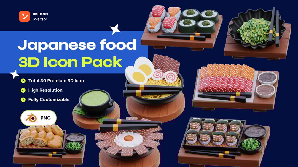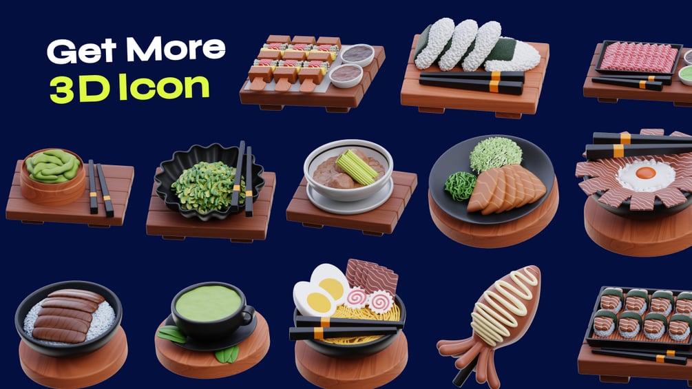 - 30 Premium 3D Icons: A diverse collection of Japanese cuisine classics (Sushi, Ramen, Sashimi, Gyoza, Matcha, Edamame, Nigiri, Maki, and more).