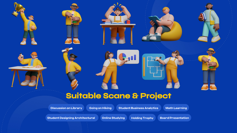 Student 3D Character pack for Websites, Mobile Apps, and more. You will get 20 premium 3D for any student activity niche. with various poses and scenes.