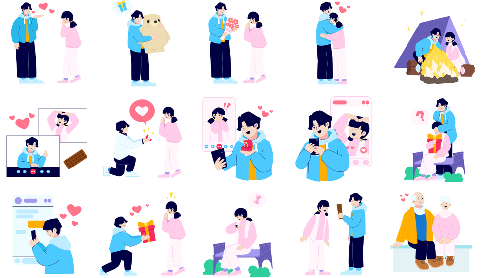 Perfect for seasonal campaigns, greeting cards, wedding invitations, social media posts, website graphics, or any project that needs a touch of love and affection. Each illustration tells a small story, from a nervous gift exchange to a cozy campfire date, making your designs feel personal and relatable.