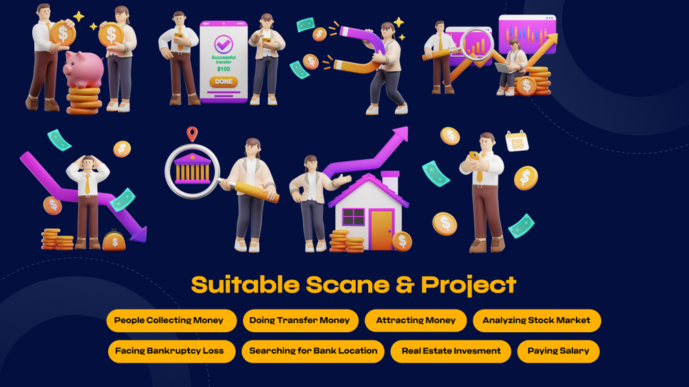 Instantly upgrade your website, app, or marketing materials with this collection of 25 premium 3D characters focused on banking, finance, and investment. This pack is perfect for fintech startups, financial services, or any project that needs to explain complex financial concepts in a simple, visual way.