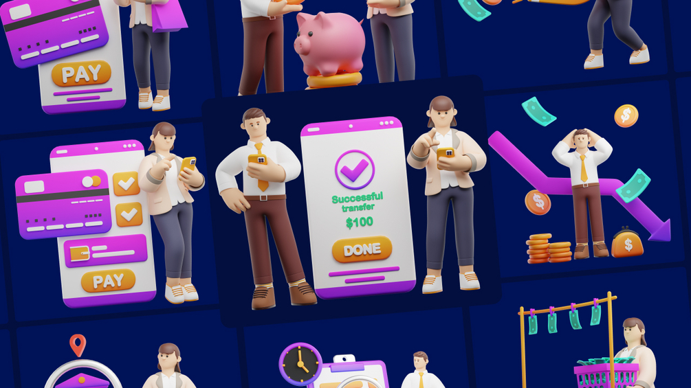 - 25 Premium 3D character: A diverse set of characters and financial concepts.